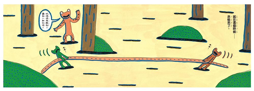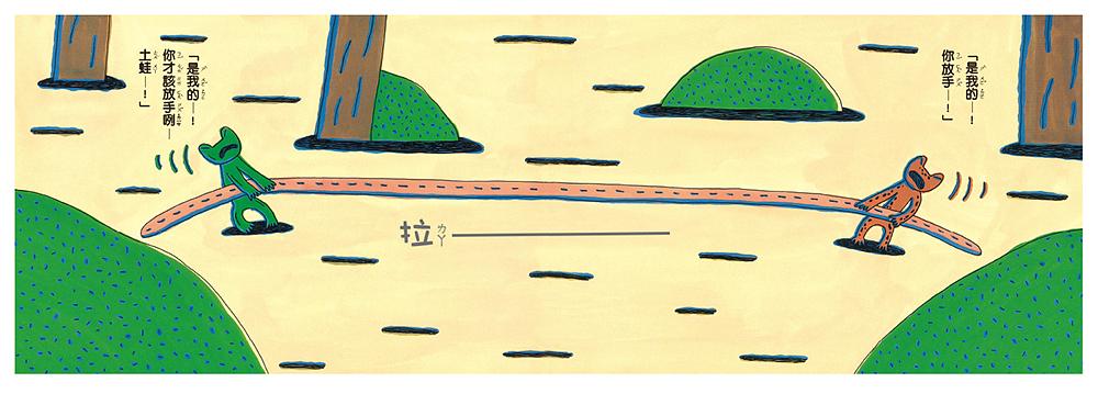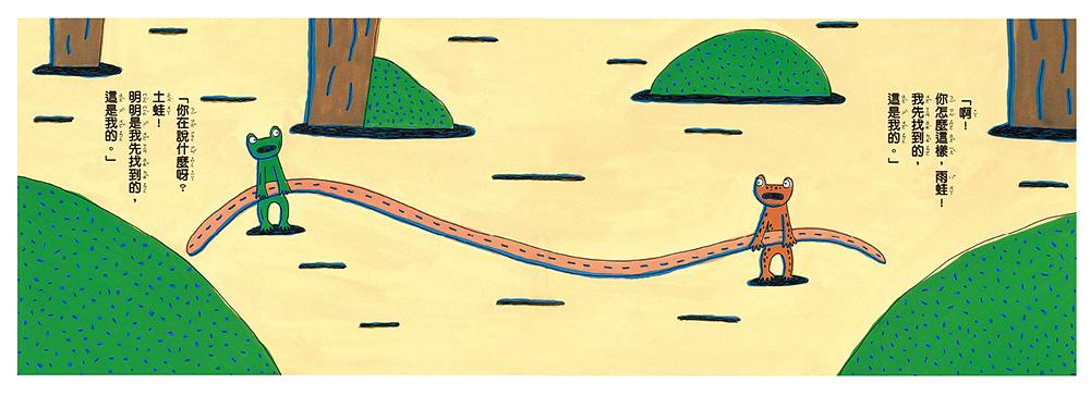 兩隻小蛙同時發現一條很漂亮的「東西」,誰也不肯讓誰的搶奪起來,接著陸續出現一隻比一隻更大的蛙類加入雙方的陣營,當大家賣力爭奪堅持不放手之際,那條「東西」突然說話了,嚇得所有的蛙兒立刻逃之夭夭……那條「東西」怎麼會說話呢?