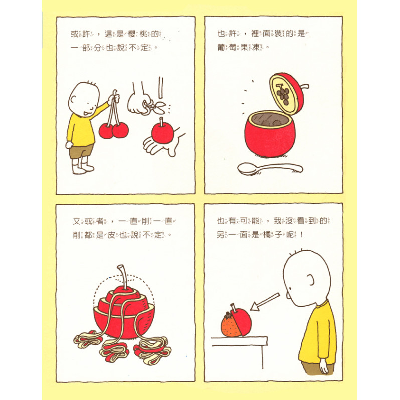 《這是蘋果嗎?也許是喔》裡頭有著孩子對蘋果上百種的想像,