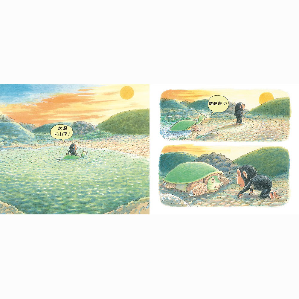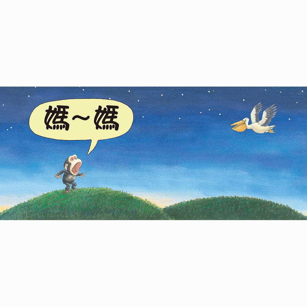 你一定有過這樣的經驗:睡覺時間到了,孩子卻耍賴說:「我還想玩」、「再一下嘛!」、「我還不想睡!」,讓大人傷透腦筋。書中的小猩猩也是一樣,不但一點睡意也沒有,還趁媽媽不注意時,偷偷溜出去找好朋友玩。他跟著朋友一路玩到了水邊,直到太陽下山,森林裡一片漆黑,這才驚覺,哭著大聲喊媽媽。看到這裡,相信讀者們都會跟著擔心起來,小猩猩要怎麼回家呢?