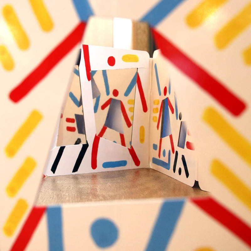 ◆視覺遊戲:把這本書圍起來,從不同的洞洞看進去,空間延伸了,透過鏡像你看見幾個人在跳舞呢?