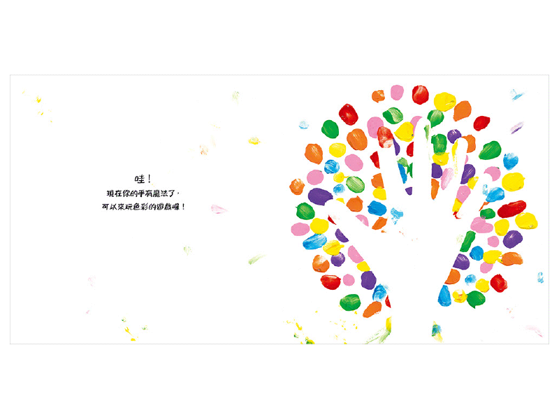 藍加黃會變成綠色、白色會讓顏色變淺,隨著指令,孩子的手能讓顏色產生各種巧妙變化……赫威.托雷以創意和遊戲的方式帶領孩子進入色彩的世界。他刻意保留了創作過程中的指印、筆觸與肌理,讓孩子看見顏色混和過程中,不可思議的層次變化,告訴小讀者:「你的手就是最好的畫筆,盡情享受這場顏色的遊戲」,引領他們在自由探索的過程中,發現色彩的奧妙。作者在故事最後還不忘提醒爸媽……
