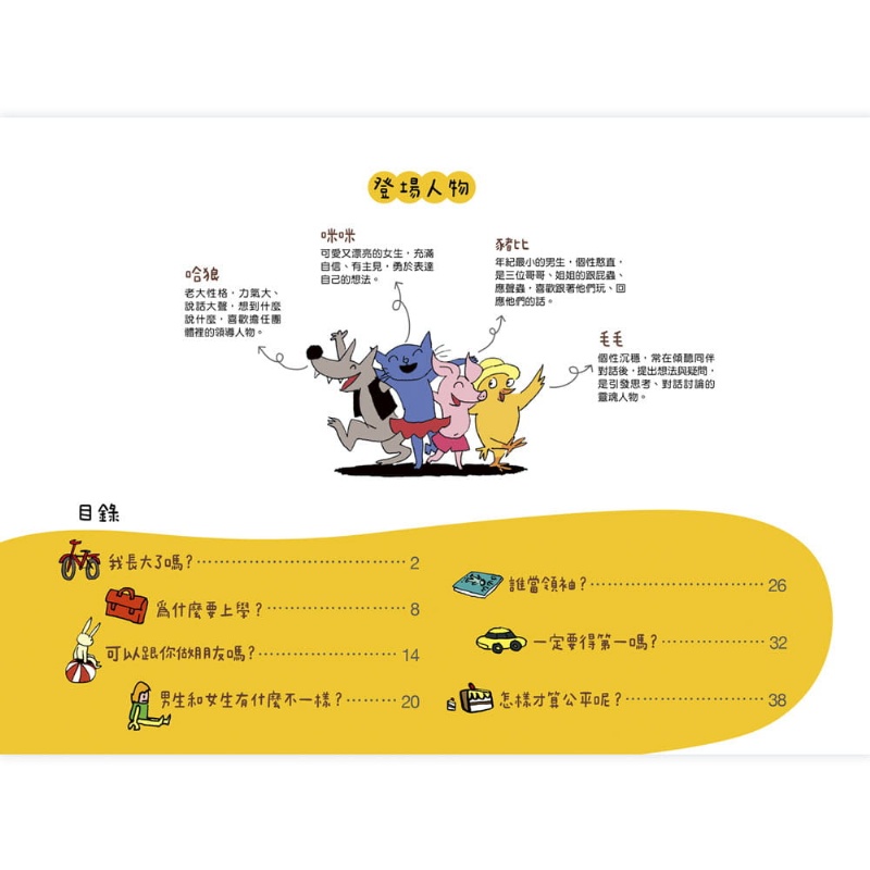 孩子天生充滿好奇心、愛問問題,常有獨具創意的想法和追根究底的精神。咪咪、哈狼、豬比、毛毛這四個好朋友,個性、想法截然不同,每天小腦袋瓜裡總會冒出許多問題,例如:怎麼交朋友、為什麼要上學、搶當第一名、換誰當領袖、比較男生和女生哪裡不一樣……,在一來一往的對話中,聽彼此怎麼說、怎麼想、怎麼解決問題,鼓勵孩子常想、敢問、主動說,培養成為勇於發表想法、會自主思辨、能解決問題的新世代孩子。而每個問題討論後,還有延伸思考提問,激盪出孩子更多的想法火花。