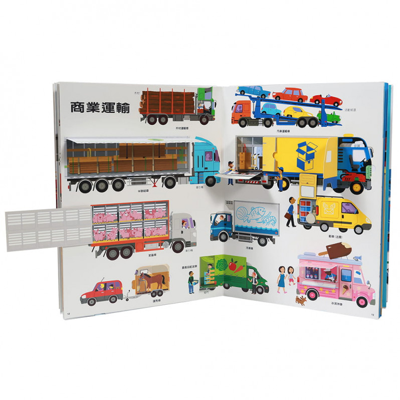 全書涵蓋11大主題,從拆除工程、緊急救援、市容清潔、公路和鐵路旅行、海上交通到太空旅行等等,精緻的圖畫呈現了交通工具和機械的外觀,還能透視內部裝備和構造,拉一拉、轉一轉零件,大人、小孩可以一起在遊戲中學習專業知識!