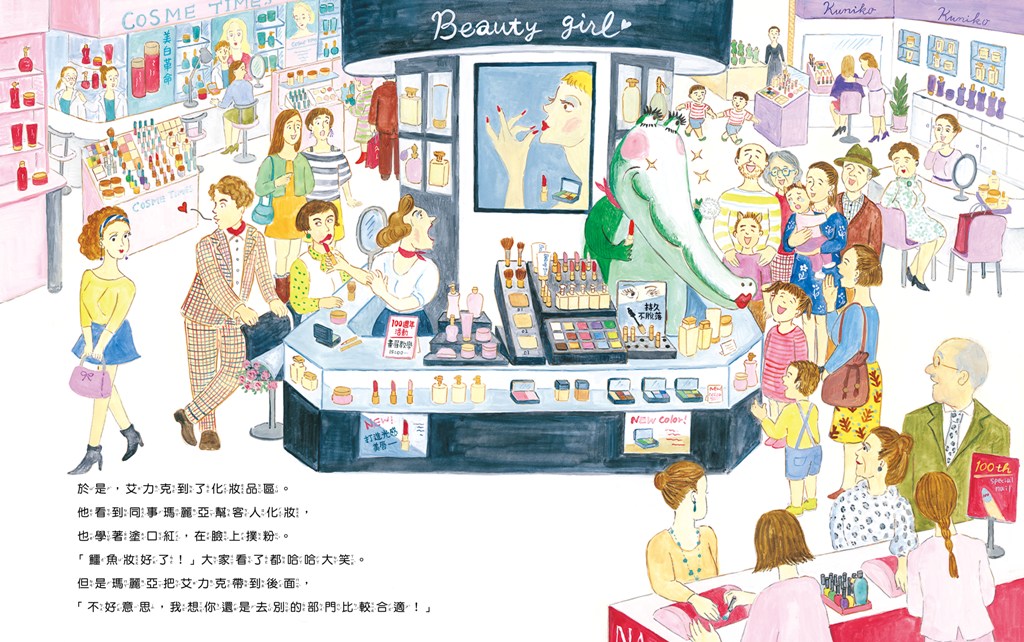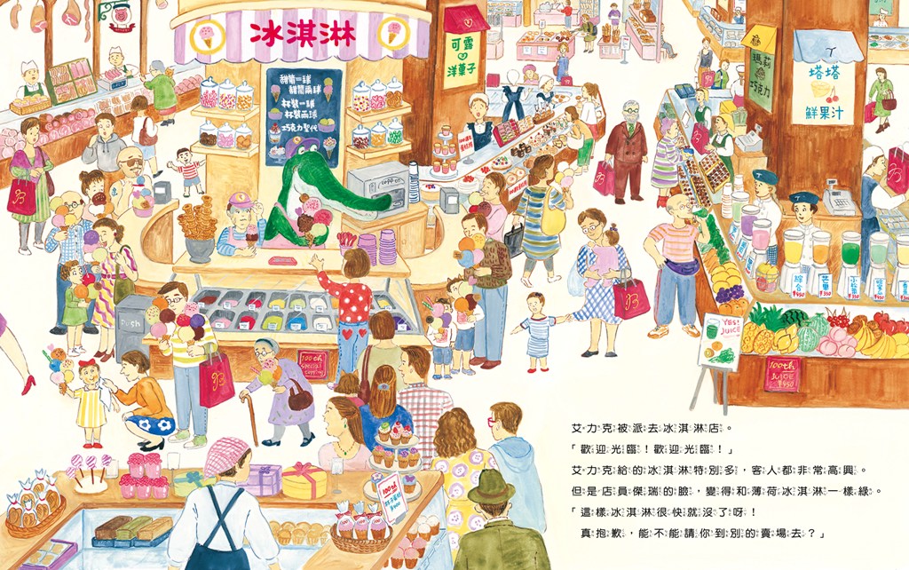 來到熱鬧非凡、地板閃閃發亮的百貨公司,每個人看起來都好開心,艾力克抬著頭望來望去,二樓、三樓、四樓…哇!看都看不完,這時,空氣中飄來香氣,惹得艾力克肚子咕嚕咕嚕的叫,「啊,我還沒吃午餐呢!」他決定先去餐廳。