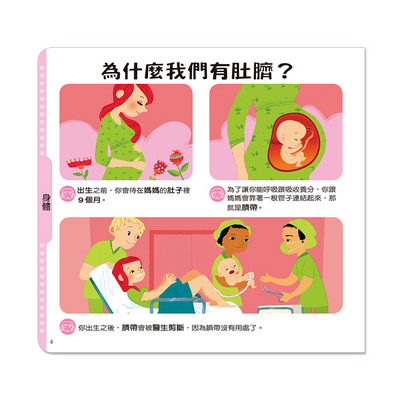 2. 涵蓋四大主題:身體、科學、動物、日常生活。每個主題在側頁分隔顏色,讓小小孩輕鬆找尋、解決疑惑。