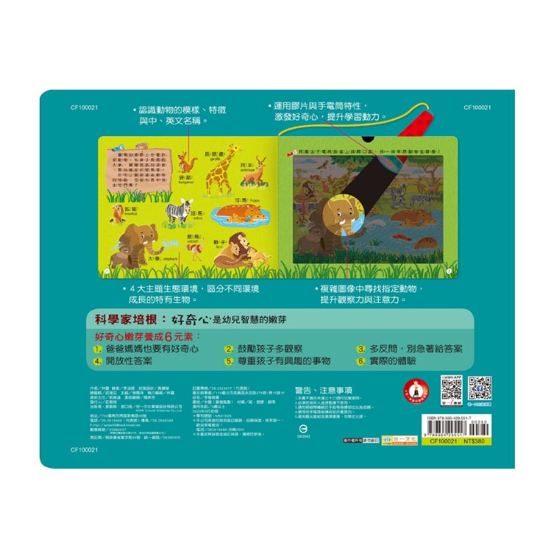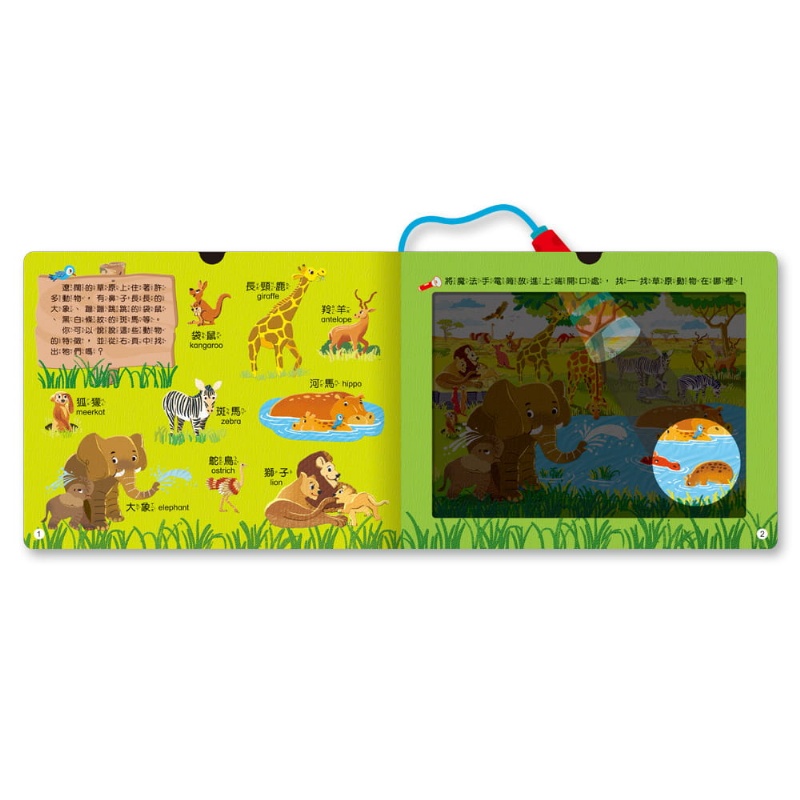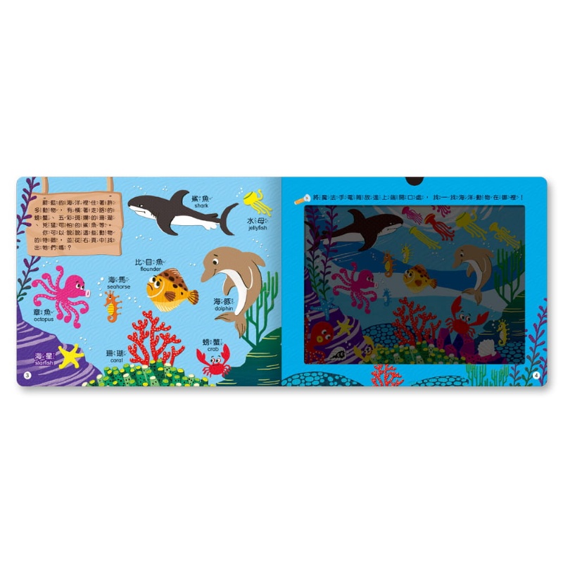 本書以動物的生活環境做分類,如草原、沙漠、海洋和極地,畫面精美。4大主題生態環境,區分不同環境成長的特有生物。特殊的膠片與「魔法手電筒」設計讓孩子享受在魔法手電筒照射之下尋找可愛動物的樂趣,可先請孩子想一想、說一說在各個地點住著什麼樣的動物,再使用魔法手電筒,讓觀察活動變得更有徵趣。也可藉由魔法手電筒與小朋友一起玩尋寶遊戲,培養小朋友的觀察力、專注力和思考力。