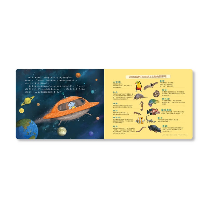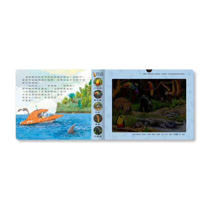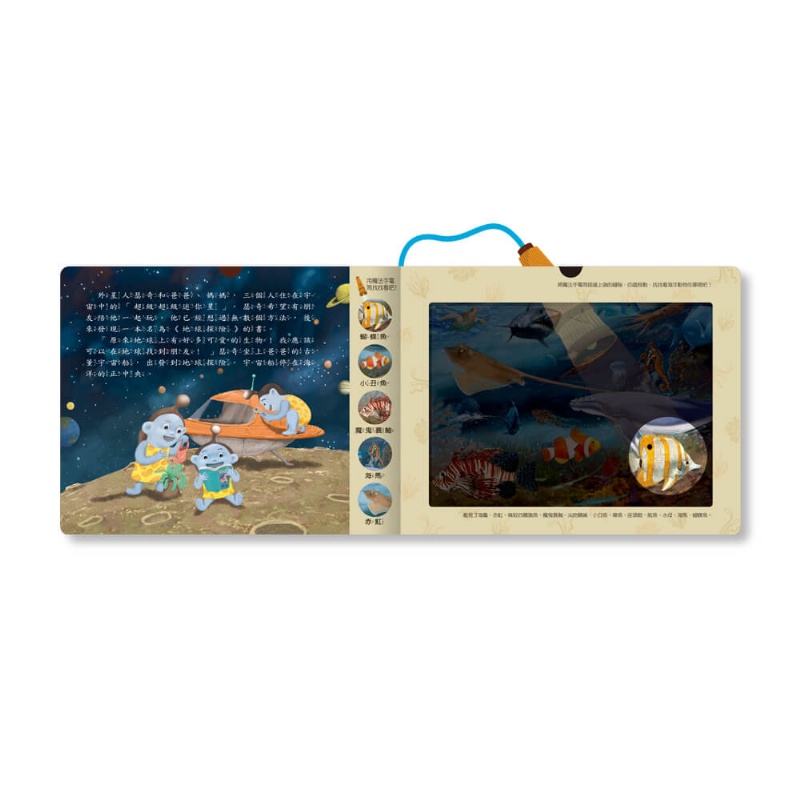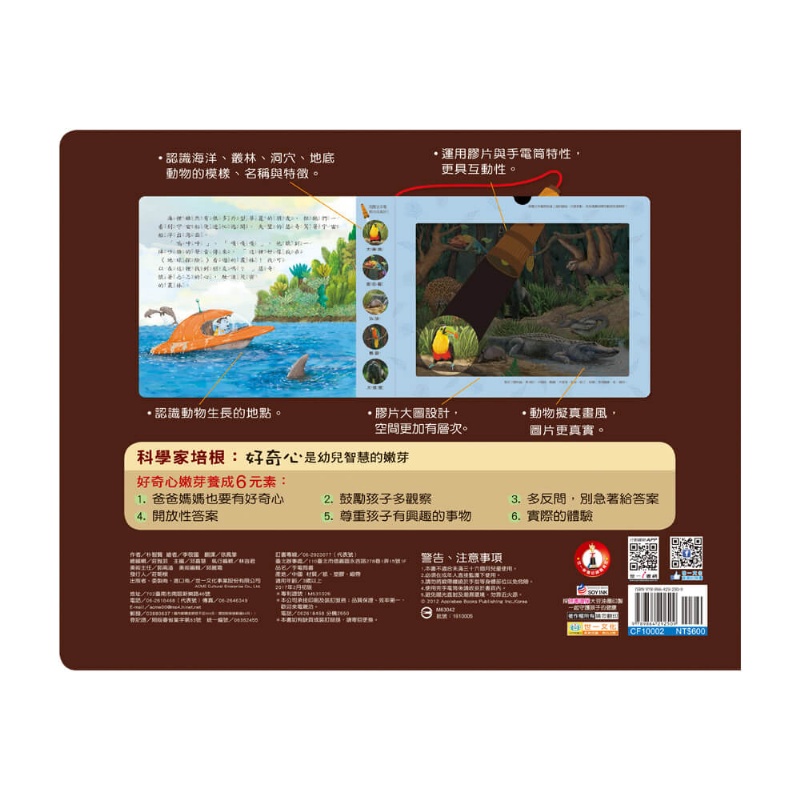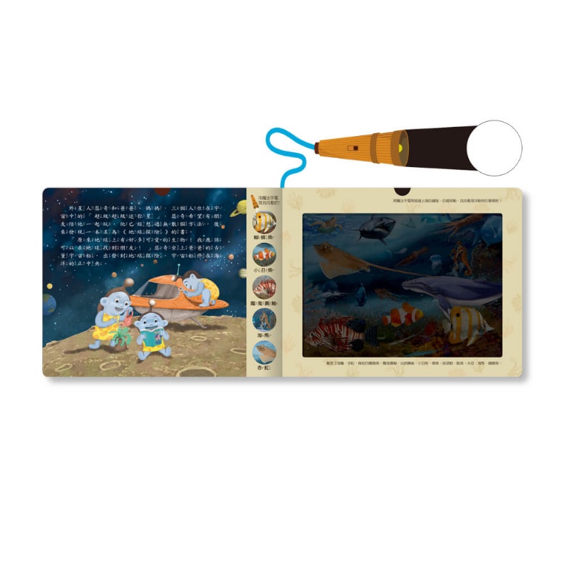 特殊的膠片與『魔法手電筒』設計,一起動手操作,享受在魔法手電筒照射之下看見地球上的可愛生物的樂趣,每個頁面都蘊藏著小驚喜,等待著小朋友發現。