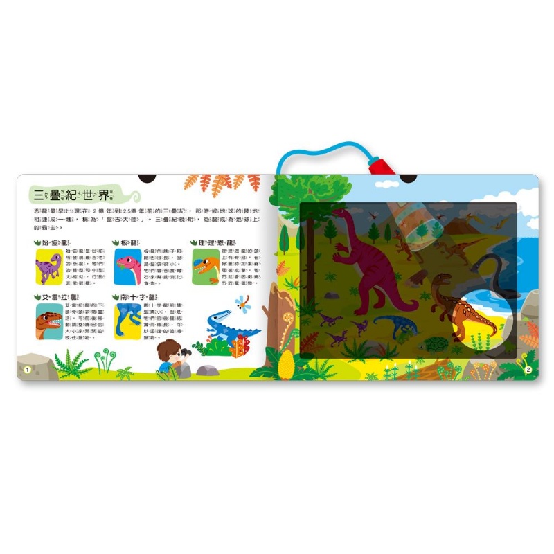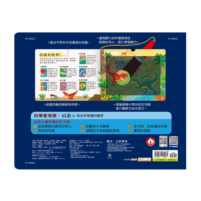 內容介紹: 全球專利設計 將紙製手電筒放入膠片中移動就能照亮物品 膠片大圖設計,空間更加有層次 拿出神奇的手電筒,找一找恐龍在哪裡! 特殊的膠片與「魔法手電筒」設計,讓孩子體驗在黑暗中探索恐龍的樂趣,不僅可以激發孩子的好奇心,還能提升學習動力!遊戲的同時還能認識來自不同年代的23種恐龍,家長也可藉由魔法手電筒與孩子一起玩尋寶遊戲,不僅可以培養孩子的專注力、觀察力和思考力,也可以藉由共讀的過程促進親子互動與親密感。
