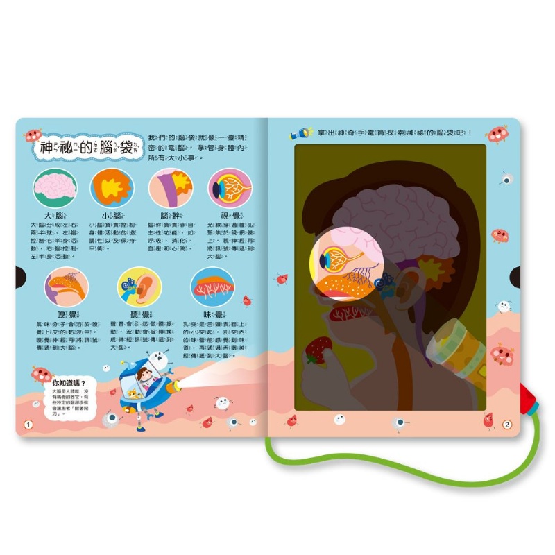 內容介紹: 拿出神奇的手電筒,找一找器官在哪裡! 特殊的膠片與「魔法手電筒」設計, 讓孩子體驗在黑暗中探索人體的樂趣, 不僅可以激發孩子的好奇心, 還能提升學習動力! 隨書附人體掛圖和器官配對貼紙, 遊戲的同時可以認識人體五大類器官, 家長也可藉由魔法手電筒與孩子一起玩尋寶遊戲, 不僅可以培養孩子的專注力、觀察力和思考力, 也可以藉由共讀的過程促進親子互動與親密感。