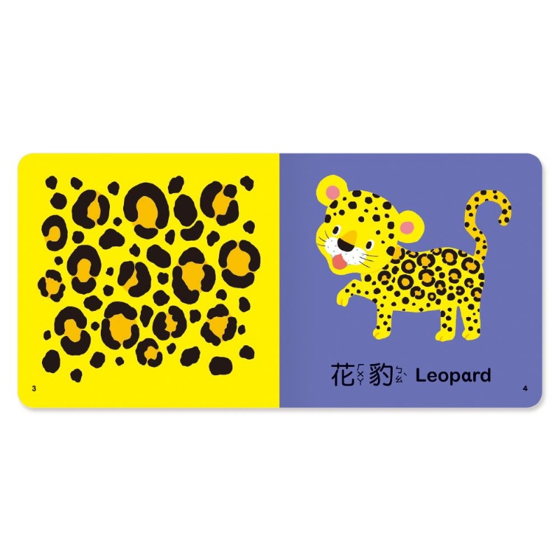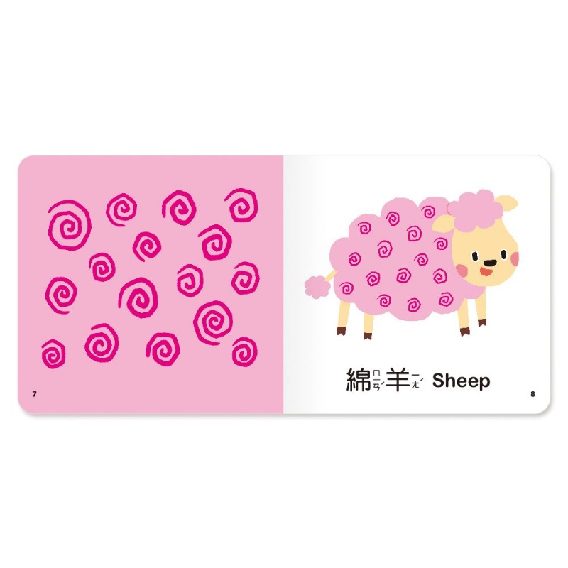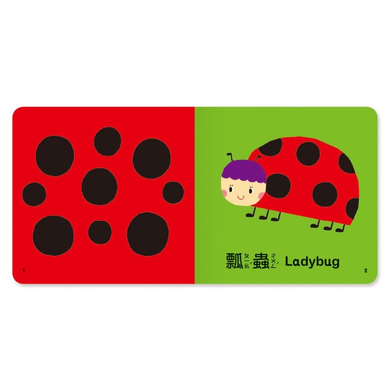 內頁文字採中英雙語,並加附注音,引導幼兒認識數字1~10,依照數字1~10的數序,搭配等量的物品,內頁特別將代表數量的物品做特殊上光處理,立體浮凸效果讓幼兒用手觸摸,達到視覺、觸覺同步學習的效果。