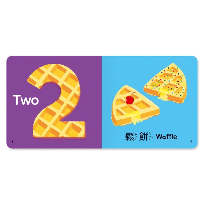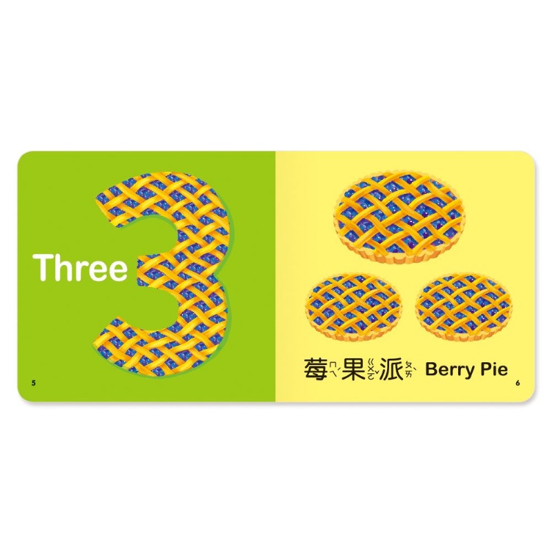 內頁文字採中英雙語,並加附注音,引導幼兒認識數字1~10,依照數字1~10的數序,搭配等量的物品,內頁特別將代表數量的物品做特殊上光處理,立體浮凸效果讓幼兒用手觸摸,達到視覺、觸覺同步學習的效果。