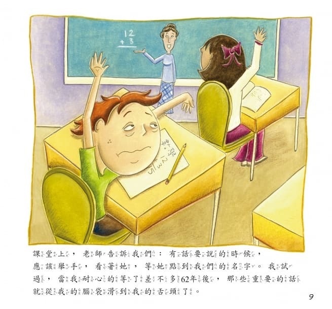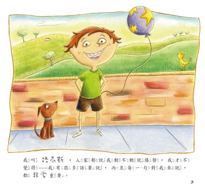 書中主角路易斯總是打斷別人講話!他的每一個想法對他來說都非常重要,他想急著說話時,那些話就開始在肚子裡嘰哩嘰哩~~咕隆咕隆,爆發(或打岔)前,那些話會在他的舌頭上搖來搖去~~擺來擺去,再從牙齒推出去。他的嘴巴是一座火山!直到有人也打斷他,他才學習怎麼耐心的等待,輪到自己發言時才講話。