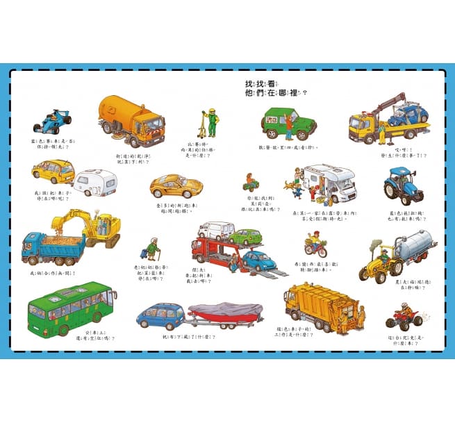 ◎短短14頁的篇幅中,包含各式車種、人物和動物,讓孩子不只學習分辨車類,還能認識動物世界!