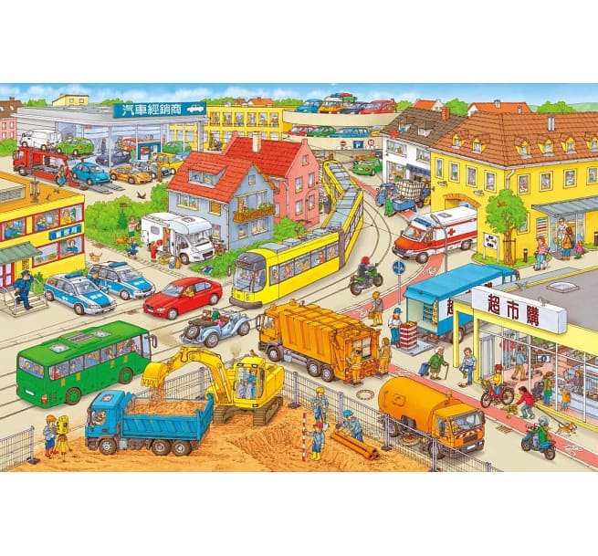 小鎮上正在舉辦車輛大遊行,有汽車、卡車、摩托車,各式各樣的車子,看起來好熱鬧呀!商家在市集廣場熱烈叫賣、消防隊員英勇滅火、高速公路上的大塞車是怎麼一回事?所有車輛聚集港口,世界大賽即將展開!跟著城市居民的腳步,前往由陸上建築工地延伸到海邊的全國巡迴大賽。