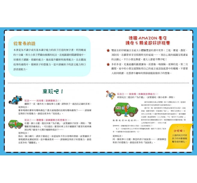 內容介紹: 翻開本書,總共有19個「找找看他們在哪裡?」,請任選1個小主題,提出多個「為什麼」,試著讓孩子回答。 例如:「獸醫歐里四處看診」,可以提出:歐里的車上有什麼圖案?歐里有被車禍困住嗎?歐里今天幫什麼動物看診……利用這些「為什麼」,連成一個小故事。