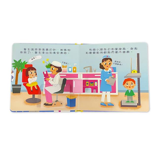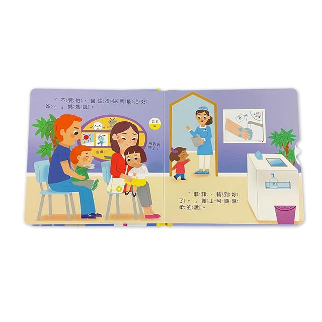 本書用生活化的故事,讓孩子「勇敢看醫生」。故事裡,菲菲和媽媽一起去醫院看醫生,透過量身高體重、打針、開藥,了解看診時會經歷的步驟流程,希望孩子第一次看醫生時再也不害怕。