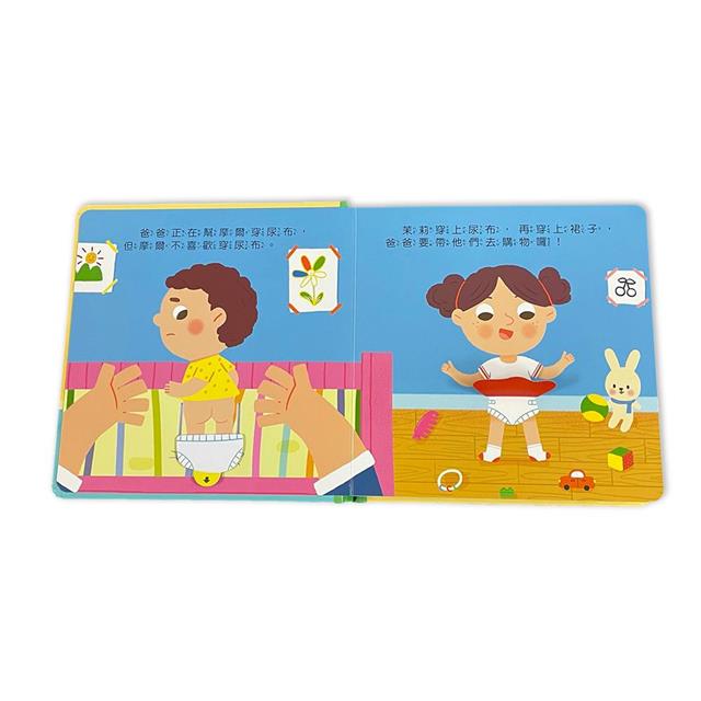 本書透過生活化的故事,讓孩子「練習自己上廁所」。故事裡,摩爾不喜歡穿尿布,於是爸爸帶著姊弟倆一起去買內褲和小馬桶,練習在小馬桶裡尿尿。雖然第一次沒有成功,還尿溼了褲子,但沒關係,每個人都有不小心的時候,只要多練習幾次,下次就會成功囉!