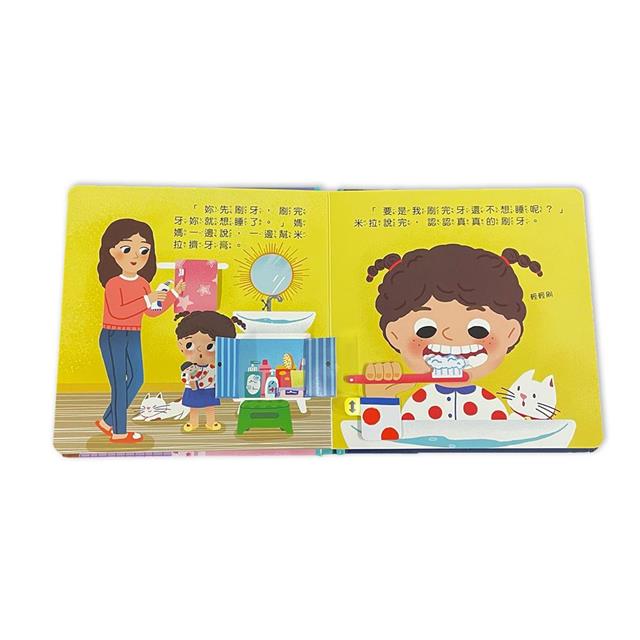 本書用生活化的故事,讓孩子「培養規律的睡眠習慣」。故事裡,米拉一點都不想睡覺,於是媽媽陪她刷牙、洗澡、聽睡前故事,透過固定的睡前活動養成規律的生活作息,並在父母的陪伴下,讓一天在美好、幸福的氣氛中劃下句點。