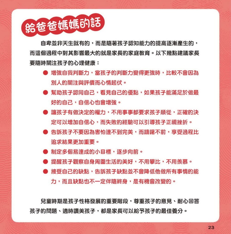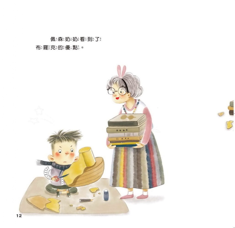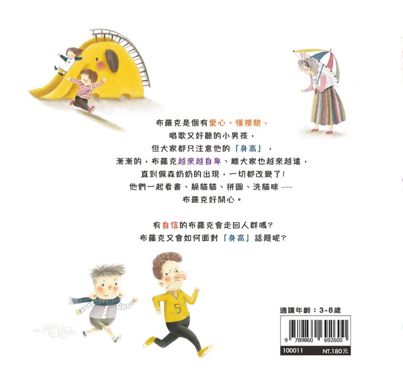 內容介紹: 幼兒成長過程中必經的8道心靈困境課題: 生氣、害怕、貪心、說謊、害羞、嫉妒、自卑、委屈 請您一起陪伴孩子提前練習 布羅克是個有愛心、懂禮貌,唱歌又好聽的小男孩, 但大家都只注意他的「身高」, 漸漸的,布羅克越來越自卑、離大家也越來越遠, 直到佩森奶奶的出現,一切都改變了! 他們一起看書、躲貓貓、拼圖、洗貓咪......,布羅克好開心。 有自信的布羅克會走回人群嗎? 布羅克又會如何面對「身高」話題呢?