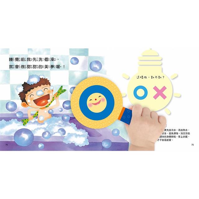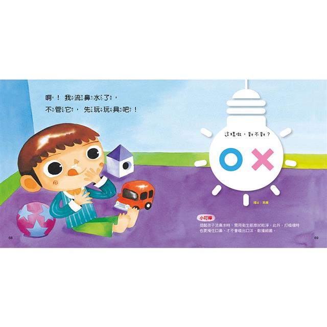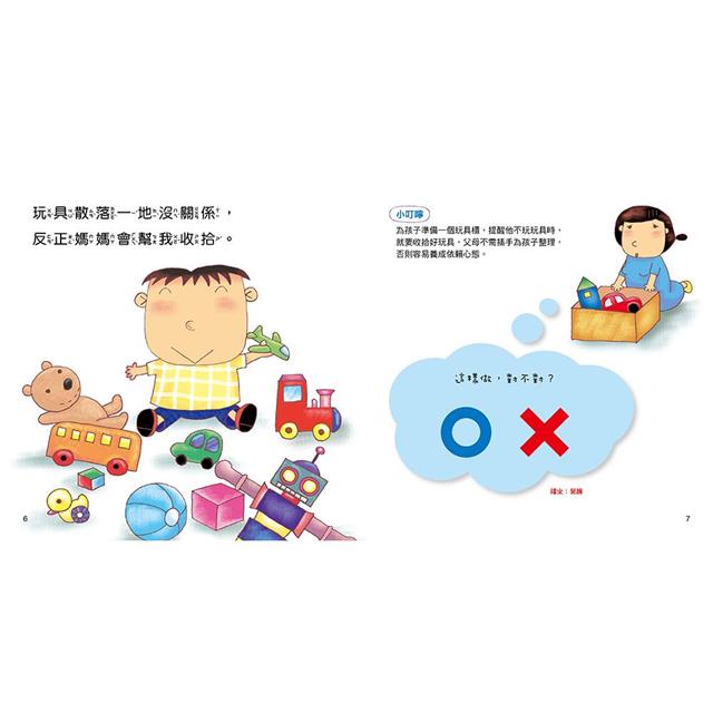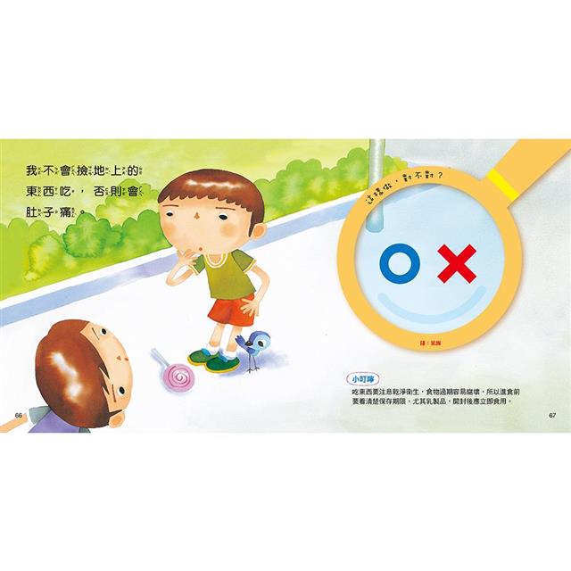 內容介紹: 1、 搭配新穎的對錯遊戲牌,讓孩子透過遊戲的方式認識常規和健康的觀念。 2、 每兩頁都有一個狀況問題,讓孩子想一想:故事裡的主角這樣做對嗎?並用對錯遊戲牌來作答。 3、 家長可參考一旁的答案和小叮嚀並與孩子共同討論,糾正孩子錯誤的行為與觀念。 4、 搭配具體相關且活潑、易懂的插圖,便於孩子看圖反省、家長依序勸導。 5、 每個行為與觀念,均附「給家長的話」,建議家長如何建立孩子良好又正確的觀念。