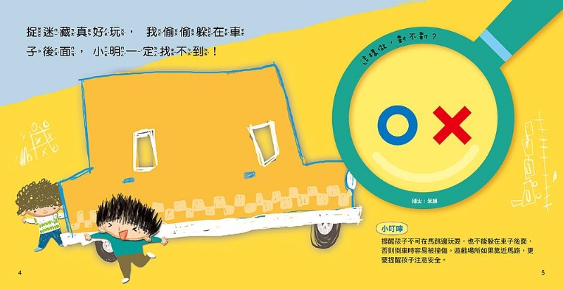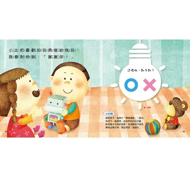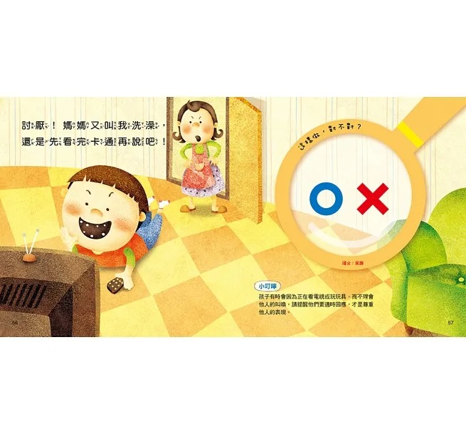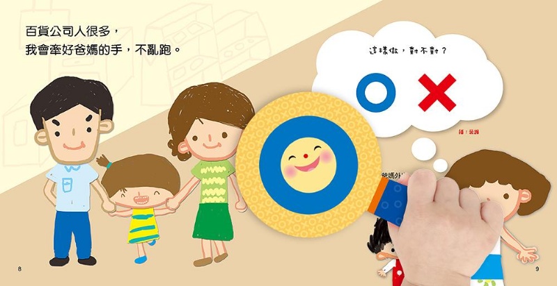 內容介紹: 本書特色 1、 搭配新穎的對錯遊戲牌,讓孩子透過遊戲的方式認識安全觀念和禮貌行為。 2、 每兩頁都有一個狀況問題,讓孩子想一想:故事裡的主角這樣做對嗎?並用對錯遊戲牌來作答。 3、 家長可參考一旁的答案和小叮嚀並與孩子共同討論,糾正孩子錯誤的行為與觀念。 4、 搭配具體相關且活潑、易懂的插圖,便於孩子看圖反省、家長依序勸導。 5、 每個行為與觀念,均附「給家長的話」,建議家長如何建立孩子良好又正確的觀念。