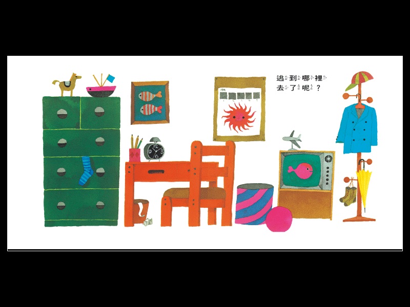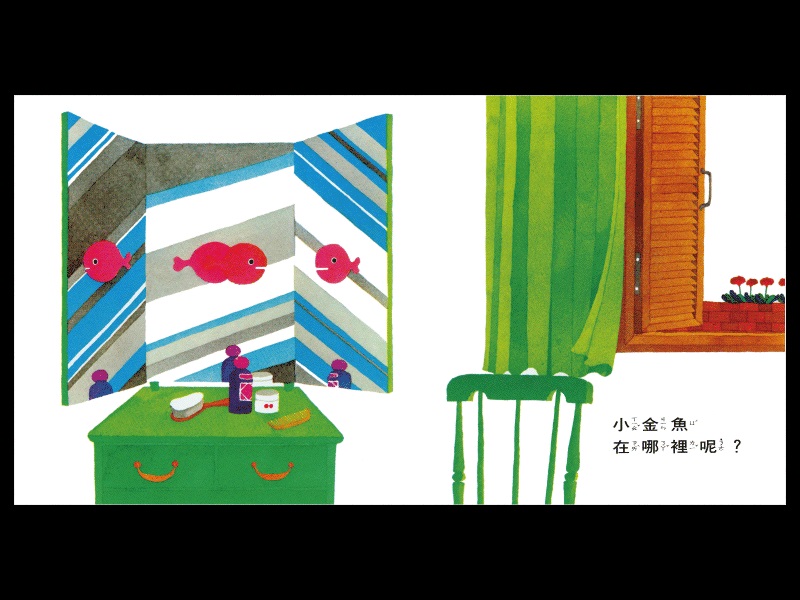 房間、玩具堆、鏡子……隨著場景越來越複雜,物品之間相似的特徵也越來越多,不但充滿了挑戰性,更增進了孩子的視覺辨識能力。故事的最後,小金魚因為找到了同伴而開心不已,終於不再逃走了。故事的文字敘述簡單,卻富含深義,讓這本書不只停留在「找一找」的遊戲而已,還有了更豐富的層次,引發讀者更深一層的想像。