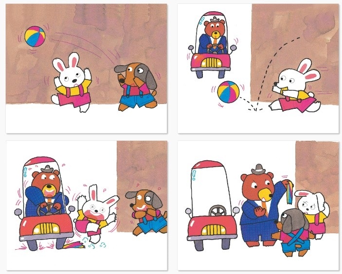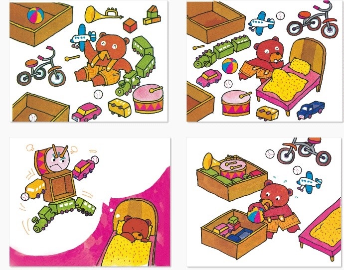 2.可以先挑出圖卡是2~3張的幾組故事。請孩子觀察圖卡,分析哪一張先?哪一張後?或者哪個是因?哪個是果?排好順序後,就可開始講故事了。