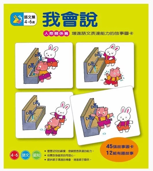 孩子喜歡看故事書、聽大人講故事,我會?t列,提供孩子說故事給別人聽的機會,以增進孩子語文表達的能力。藉由「故事圖卡」塑造故事情境,生活化的故事圖卡,也提供良好的行為示範供孩子模仿,讓孩子從不同的角度,體驗別人的感覺和想法,培養同理心,並學習適時表達情緒及增進解決問題的能力,增進孩子情緒、社會能力的發展。