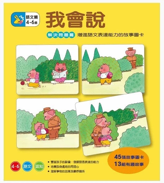 孩子喜歡看故事書、聽大人講故事,我會說系列提供孩子說故事給別人聽的機會,以增進孩子語文表達的能力。藉由「故事圖卡」塑造故事情境,讓孩子嘗試表達心中的想法,爸媽可以從旁加以引導,讓孩子認識更多的詞彙,表達得更完整、更精確。