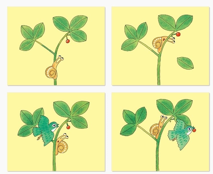 2.可以先挑出圖卡是2~3張的幾組故事。請孩子觀察圖卡,分析哪一張先?哪一張後?或者哪個是因?哪個是果?排好順序後,就可開始講故事了。