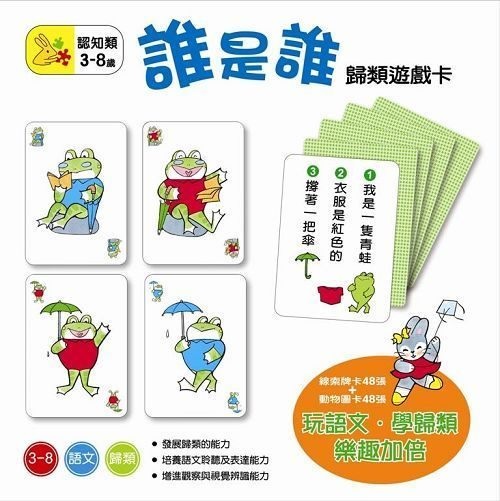 誰是誰歸類遊戲卡,是為設計嚴謹的語文活動。爸媽可以利用線索牌,引導孩子接觸不同的語文句型,並在觀察牌卡的圖像條件中,訓練孩子聽說、配對的能力,促使孩子對語文產生興趣。