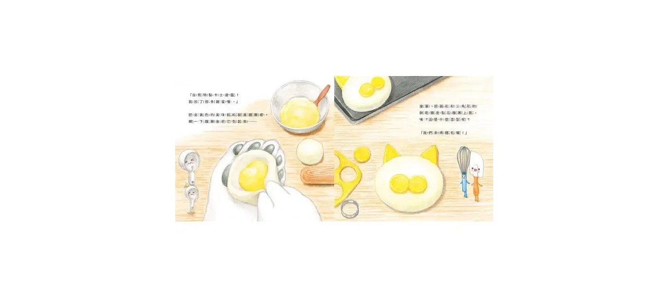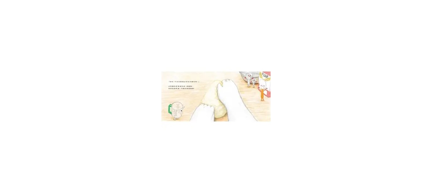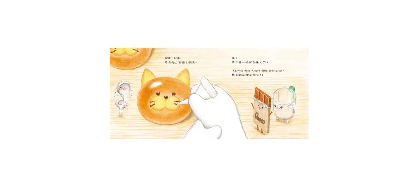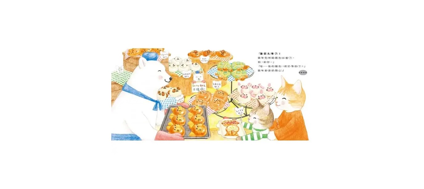 從前面開始看,是白熊麵包師傅開店跟做麵包的視角;從後面開始翻,是貓咪弟弟與媽媽一起挑麵包的過程。當白熊麵包師傅將剛出爐的麵包,親手交給貓咪弟弟時,兩個故事便因為香噴噴的麵包而相遇!