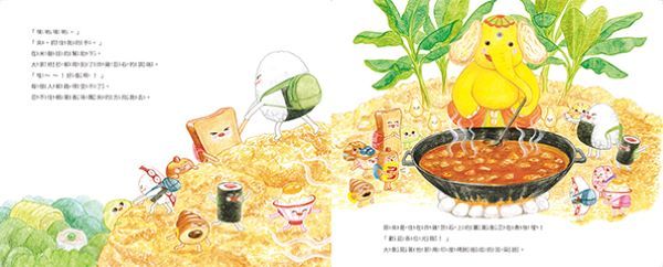 在繪本作家佐藤芽實萌到不行的想像世界裡,不僅所有角色都是生活中常見的食物,連路邊開的花、腳底踩的石頭都是各種佳餚。只要打開書頁,你就能遠眺高聳的馬鈴薯沙拉山、俯瞰玉米濃湯池,甚至徜徉在綿延不絕的金黃色蛋包上。