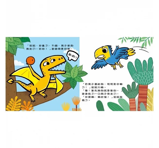 始祖鳥妞妞和大家在玩遊戲,但是已經玩好久了,還耍賴不願意換人玩,大家都因此不喜歡跟耍賴的人玩!她和翼手龍達達比賽,贏的人就可以得到樹上的紅色大果子,愛耍賴的妞妞能夠順利得到嗎?