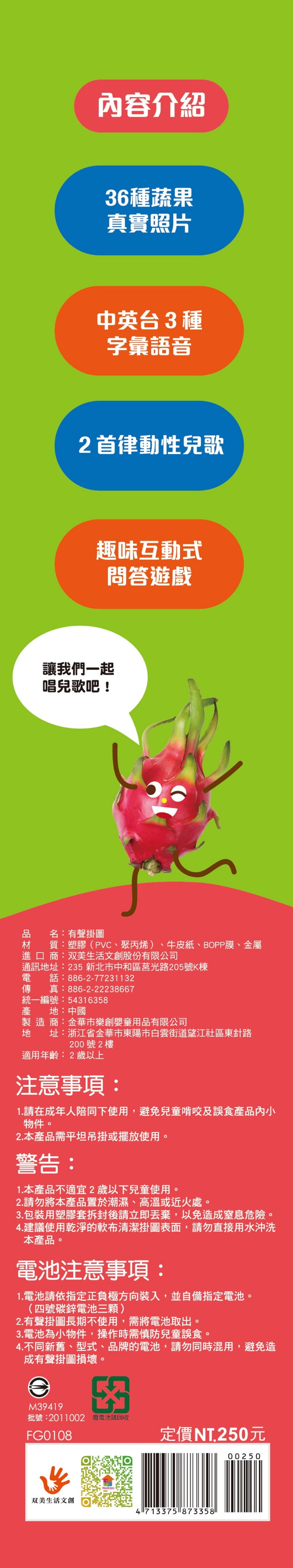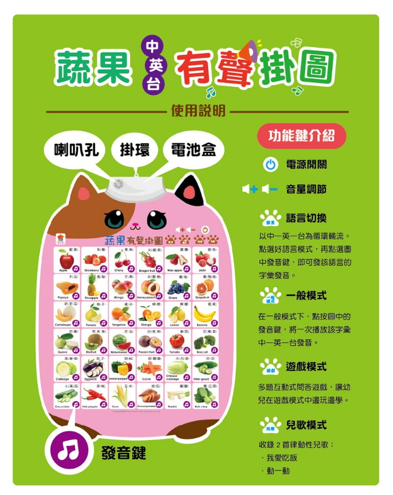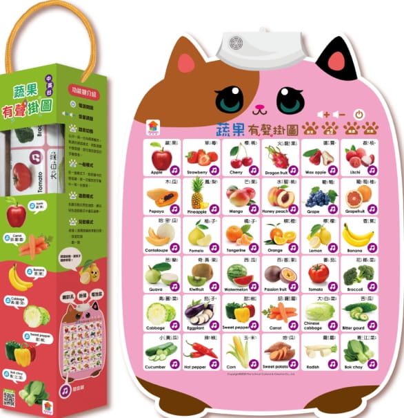 學齡兒都好奇的36種蔬菜水果,搭配精美的真實圖片及有聲學習,輕鬆奠定認知基礎、擴展生活詞彙量,更增添學習樂趣。