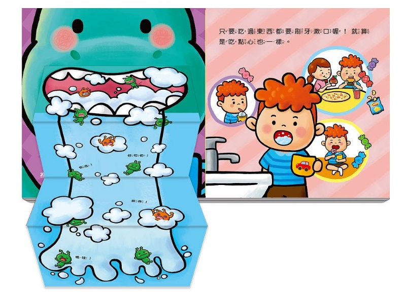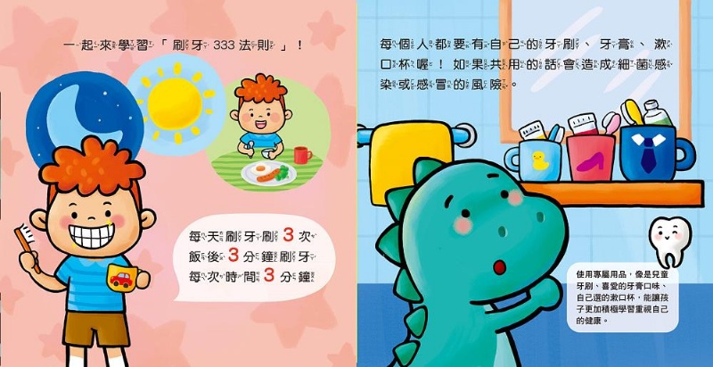 這些話像不像家中小寶貝平常會說的話呢?充滿想像力的故事情節,藉小恐龍之口提出孩子們的疑問,同時也讓孩子扮演回覆的角色,回覆不再是教條式的說明,而是添加了親子間的想像力!搭配明亮可愛的畫風,增加孩子對刷牙的興趣,建立滿滿的趣味感與養成好習慣!