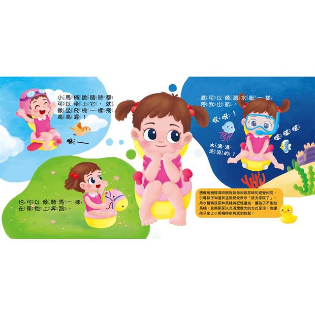 充滿想像力的故事情節,搭配明亮可愛的畫風,打破孩子對馬桶冰冷且未知的恐懼,建立滿滿的安全感與穩定情緒!而藉由觀察書中主角上廁所的有趣過程,加上多種驚喜小機關,不僅讓閱讀變得更有趣,也能激發孩子主動觀察尿意與便意、學習如廁技巧、健康知識、衛生禮儀等動機。您的寶貝還戒不掉尿布或正準備學上廁所嗎?現在就來聽聽專家怎麼說!