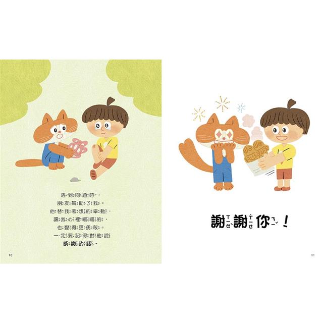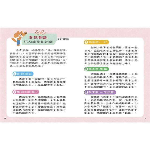 書中教的話語雖然看起來不難,但對於某些孩子來說,要說出口會有點害羞,因此家長除了一起閱讀繪本外,還可利用本書所附的「好人緣互動遊戲圖卡」來與孩子遊戲,逐步引導孩子習慣開口說這些日常中經常會使用的話語。當孩子能說出有禮貌、關懷他人的話,以及懂得用正確的話語來避免與人發生衝突,自然會得到其他人的喜愛,並與人有良好溝通,對人際關係有正面的影響。