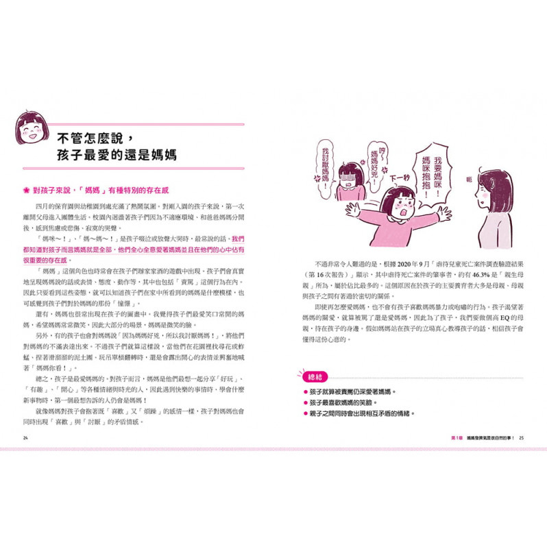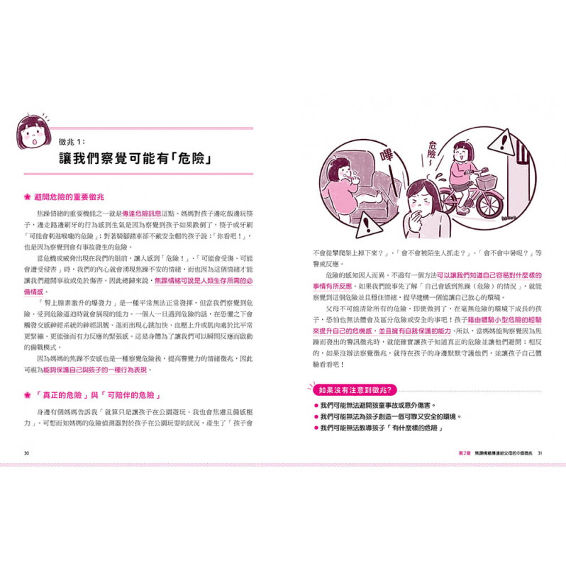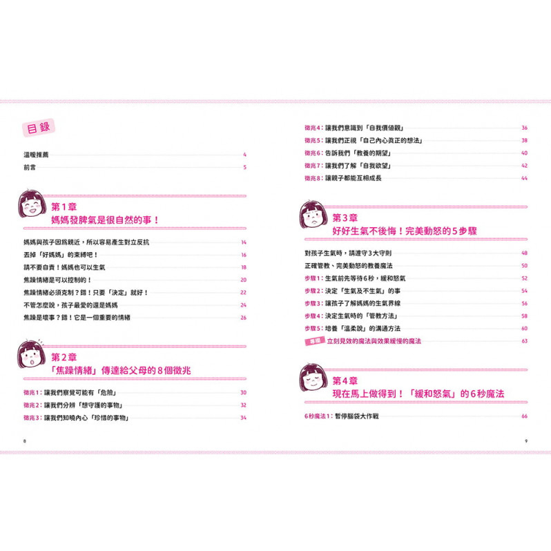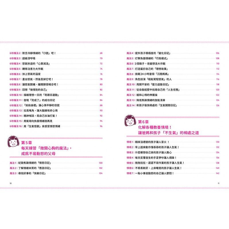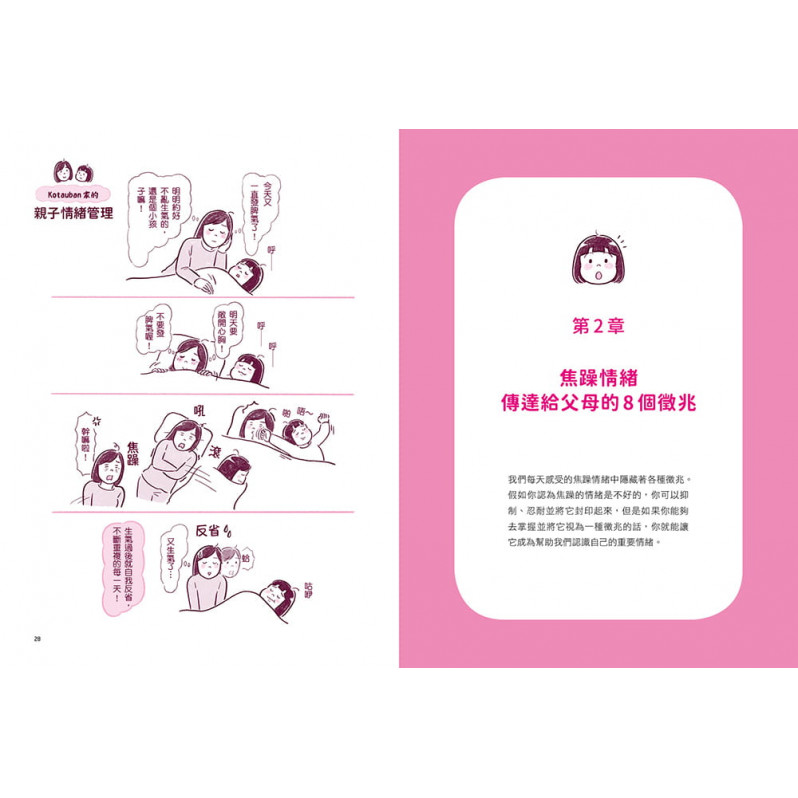 最終章收錄22個常見教養情境,以及知名插畫家Kotsuban與女兒練習情緒管理法的可愛插畫。透過本書將能使親子關係更加和諧,而父母及孩子都能一步一步成長為善於掌握情緒的完整個體。