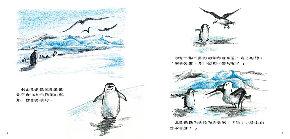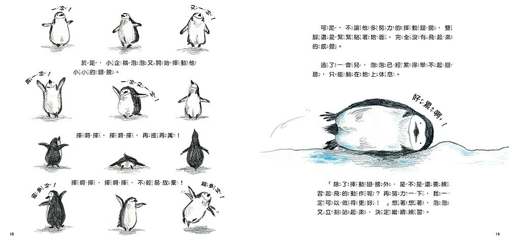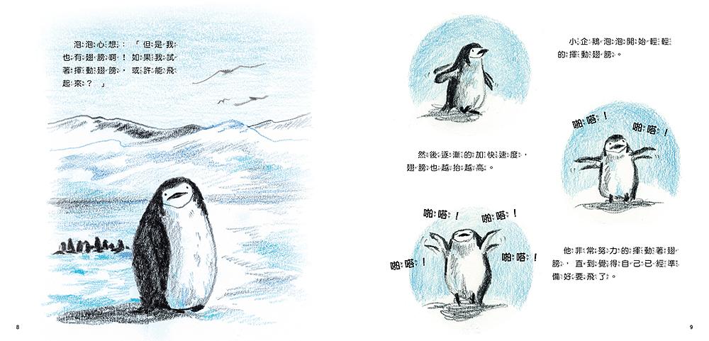 小企鵝泡泡想和其他鳥兒一樣在天空飛翔,但是大家都告訴他:「企鵝不會飛。」就連爸爸也不例外。泡泡不想就這樣放棄,他心想:「企鵝也有翅膀,為什麼不能飛呢?先試試看再說吧!」於是他努力的揮動翅膀學飛,他相信自己一定可以飛!雖然,經歷了一次又一次的失敗,但小企鵝泡泡不氣餒,反而更努力的揮動翅膀,最後,他和爸爸一起發現了與飛翔同樣快樂的事,實現了夢想,並大聲說出:「我會飛!」