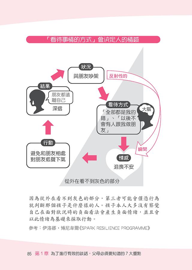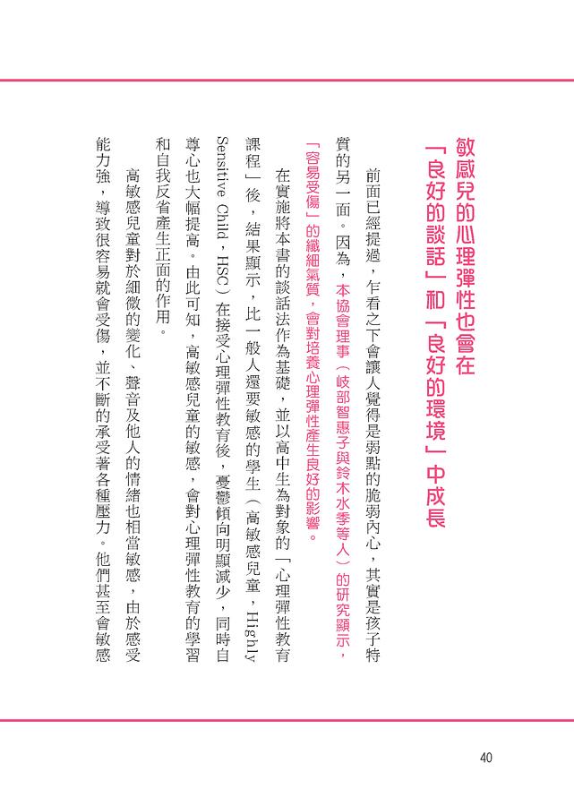 現代社會每天都會經歷劇烈的變化和多種的壓力,像是疫情改變了上學型態、社群網路上的糾紛等等,但是既然生活中充斥著許多壓力,就不可能完全避免遇到困難和挫折,因此對現在的孩子而言,不只是外在學習能力,同時也需要培養戰勝困境的內在生存能力;父母想要培養能夠抵禦逆境的高韌性心態,可以從每天在家就能做到的「溝通」來建立心理彈性,每一次的親子談話不只是閒話家常而已,而是以「保護孩子內心的教育」為出發點,不僅要理解孩子說的話,還要找出孩子是基於什麼樣的心情才會說出這種話,並且將這些心情轉換為言語與孩子交談。
