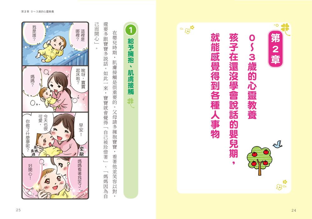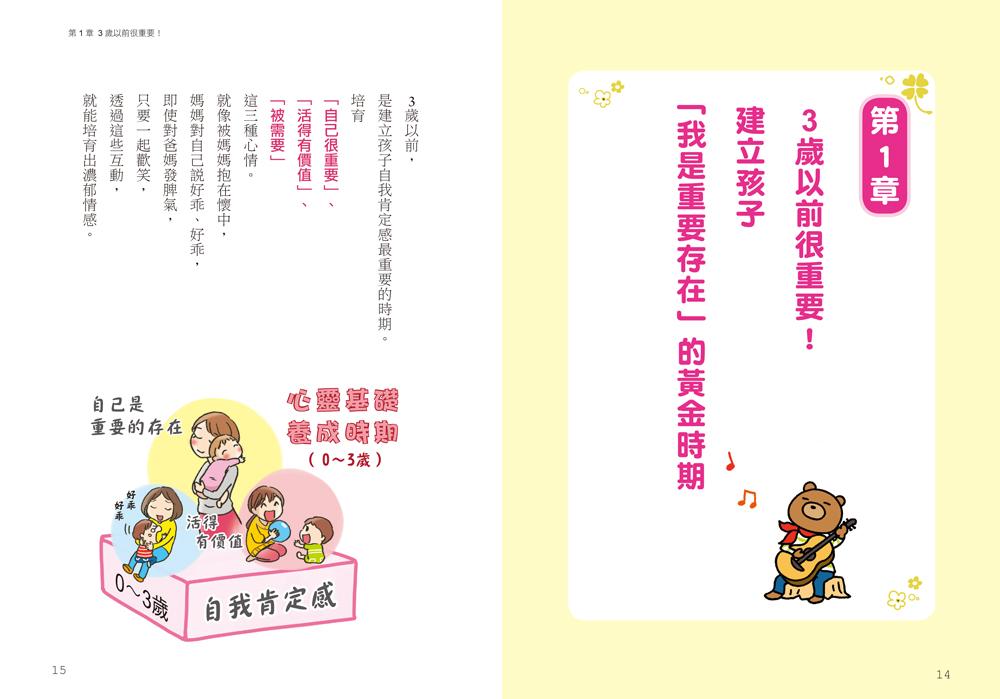 0~3歲時期,是我們能為孩子打造「自我肯定感」的心靈基礎年齡,所謂的自我肯定,簡單來說就是讓孩子抱持著「自己是很重要的」、「活得有價值」、「被需要的」心情。這不需要額外多做些什麼,就像被媽媽抱在懷裡的感覺,就算偶爾鬧個小脾氣,也能繼續一起大笑,透過生活中的點點滴滴,一起享受共處的時光,就能培養出肯定自我的價值。而書中作者還提出更多新世代的教養觀念: