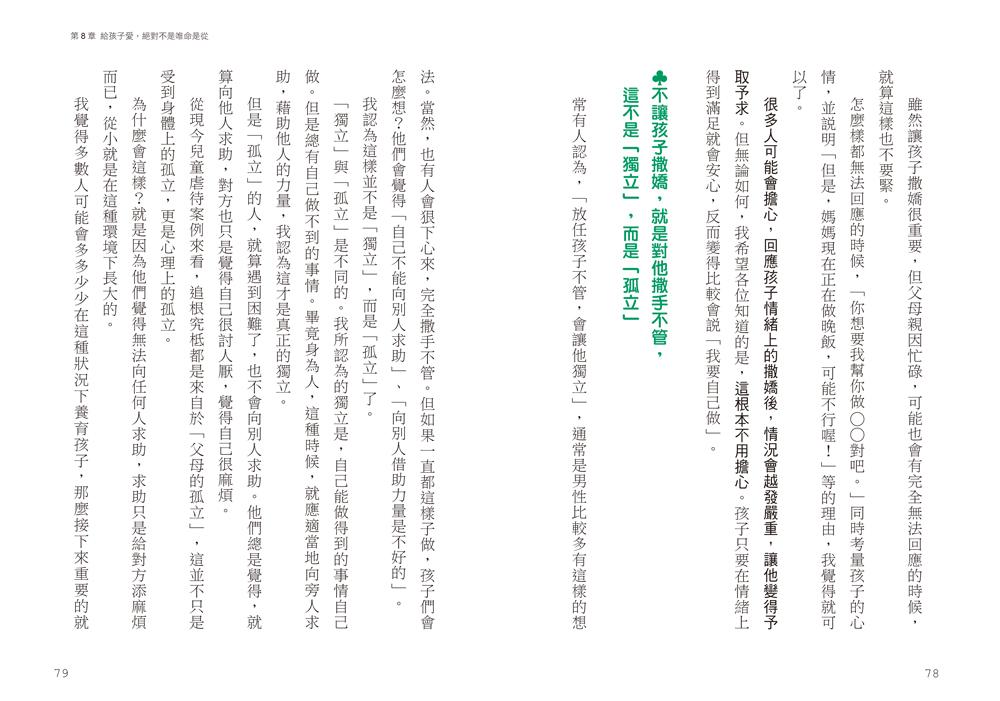研究顯示,「自我肯定感低」的父母,較容易在育兒路上產生自我質疑與焦慮情緒,間接影響到孩子的心靈。書中針對自我肯定感低的父母,提出如何正向自我鼓勵的建議,在養育孩子的過程中,愛的力量讓孩子幸福,我們也因此願意變得更強大。父母們是否也曾出現這些情緒難處: