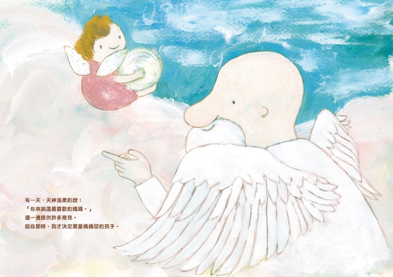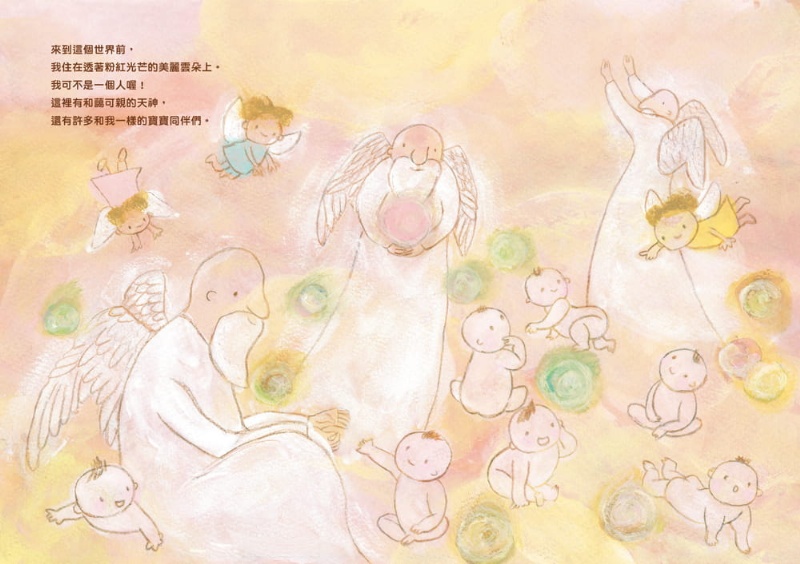寶寶出生前,住在粉紅色、軟綿綿的雲朵上面,和親切的天神,還有其他寶寶們一起生活。有一天,天神叫寶寶來選擇自己最喜歡的媽咪,還叫寶寶從堆得滿滿的禮物區中挑選一個禮物,並帶著它到媽媽身邊。寶寶最後選了什麼禮物呢?最喜歡的媽咪,又是什麼樣的媽咪呢?本書以孩童天真可愛的口吻,道出寶寶出生前的點點滴滴,以及訴說著與媽媽相遇的喜悅及幸福,適合親子共同賞讀。