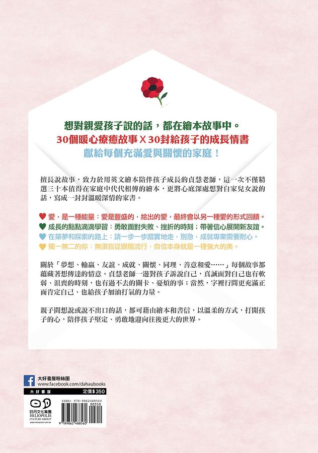 ★鎖定30個想跟孩子探討的主題:關於霸凌、同理、諒解、尊重、挫折、友誼……每個主題分享一封家書,延伸介紹30個值得傳家的繪本故事。