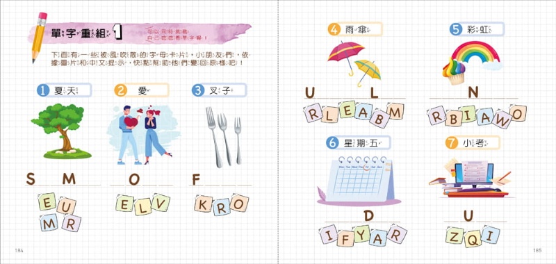書中運用教育部公佈的1200單字,以最簡單、實用的單字貫穿全書,再透過大量小練習和遊戲,以輕鬆的方式幫助讀者複習書中所學單字。由連連看練習「辨認」單字、單字重組練習「單字拼寫」,不同的形式可以由不同層面著手複習單字,玩著玩著,自然而然學會單字!