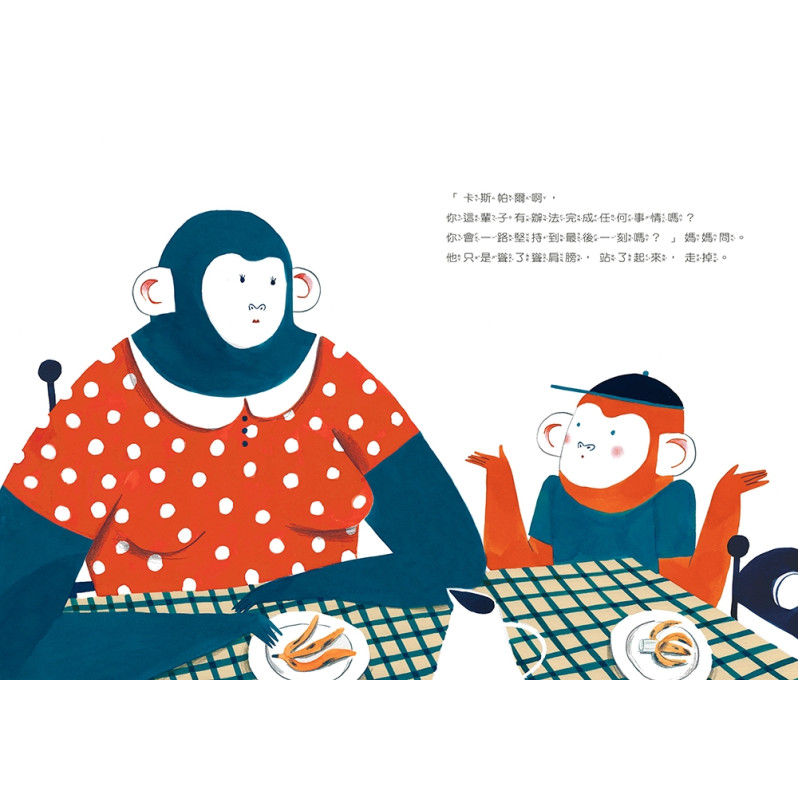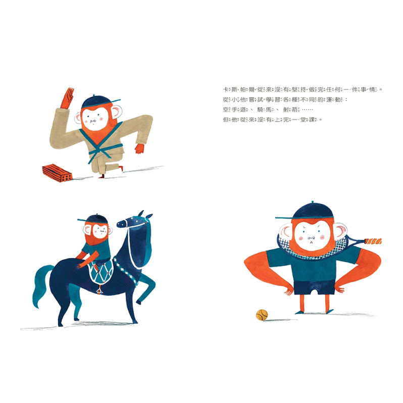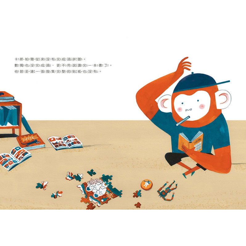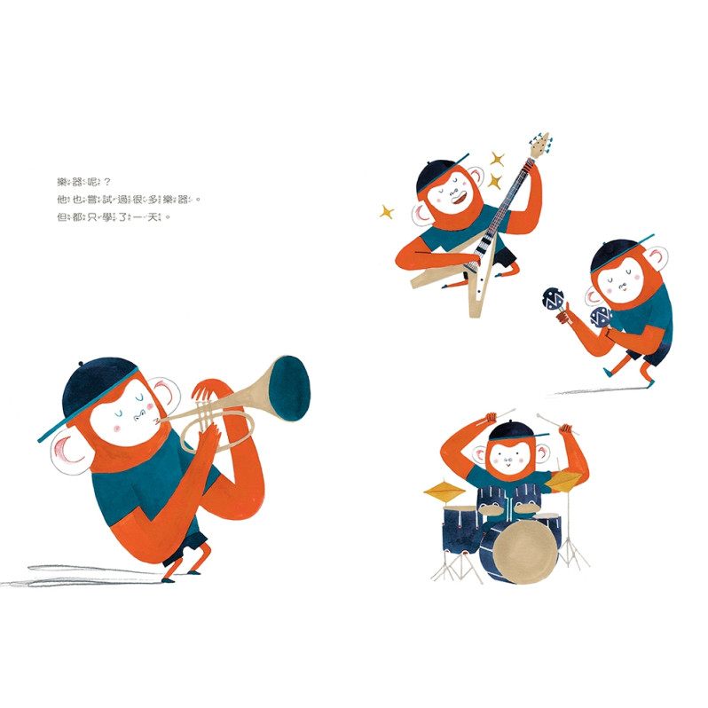 小猴子和所有孩子一樣,做事總是三分鐘熱度。從小他嘗試學習各種不同的運動:空手道、騎馬、射箭……但他從來沒有上完一堂課。樂器呢?他也嘗試過很多樂器。但都只學了一天。拼圖、閱讀也是都一樣,從來沒有完成過。「你這輩子有辦法完成任何事情嗎?你會一路堅持到最後一刻嗎?」媽媽總是很煩惱地問。但小猴子只是聳了聳肩膀,走掉,看似蠻不在乎的樣子。透過畫面,我們會看到小猴子連吃香蕉,都只吃了一半。這樣的畫面,看在小讀者眼中,也像照鏡子一樣,想想自己不也是這樣嗎?讀了也會不禁莞爾一笑吧!
