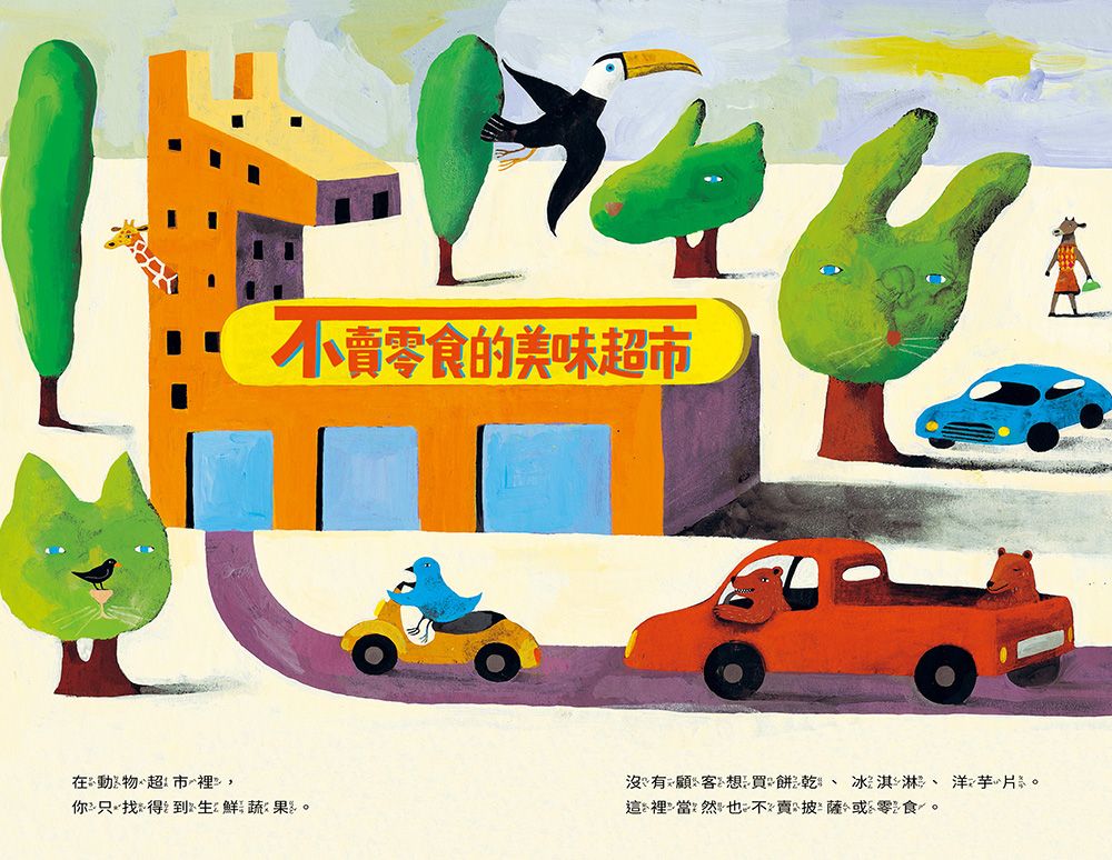 這本書除了帶我們走進動物們活力四射的採買現場,妙趣橫生的圖畫細節也是一大看點!修剪成貓咪、兔子形狀的樹木、長頸鹿造型的超市建築、動物們各個獨具風格的時尚穿搭……更多小巧思就藏在書頁裡。