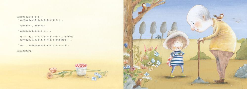 變成美麗的東西……」祖孫倆對話中自然流動的情感、直白單純的提問、具體易懂的美麗比喻,搭配繪者溫暖的圖片,讓這本書談論起死亡來,顯得輕柔又平易近人。