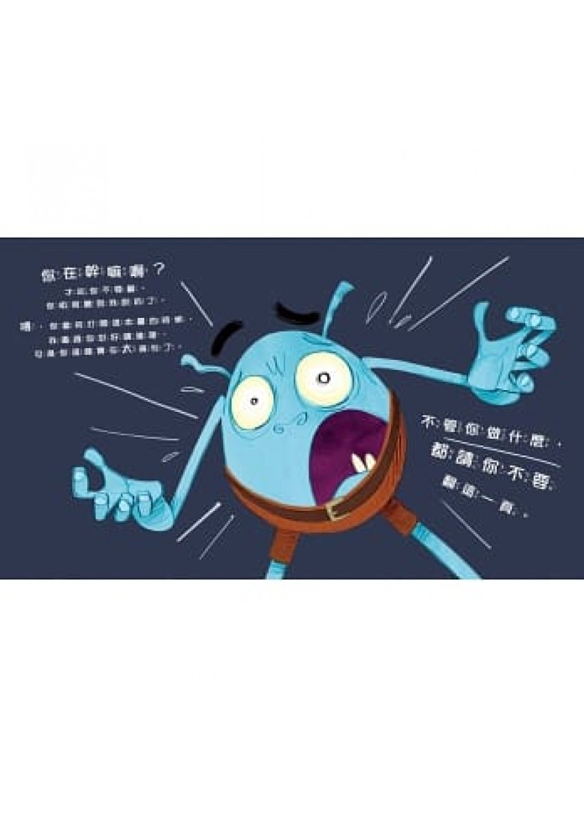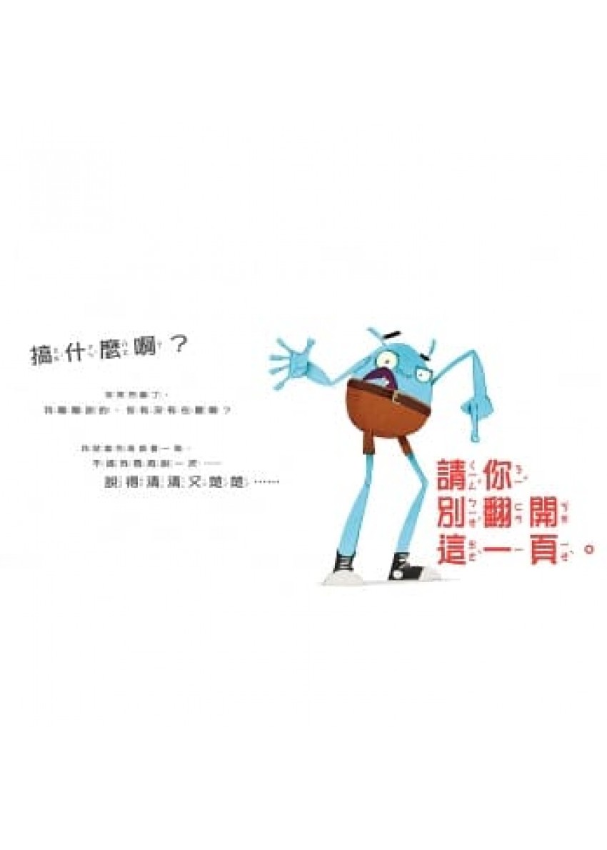 從故事的第一頁,讀者就無法逃脫與書中藍色精靈的互動,從「翻頁的動作」開始,藍色精靈就千方百計想阻擋「你」往下翻頁,用盡各種激將法、哀聲求饒、說故事嚇人的招數,仍舊在讀畢的命運下,迫不得已無奈變身,最後以一隻綠色青蛙的面目示人。讀者看著圖畫中藍色精靈渾身是戲,隔著書頁與自己喊話,不禁覺得好氣又好笑。